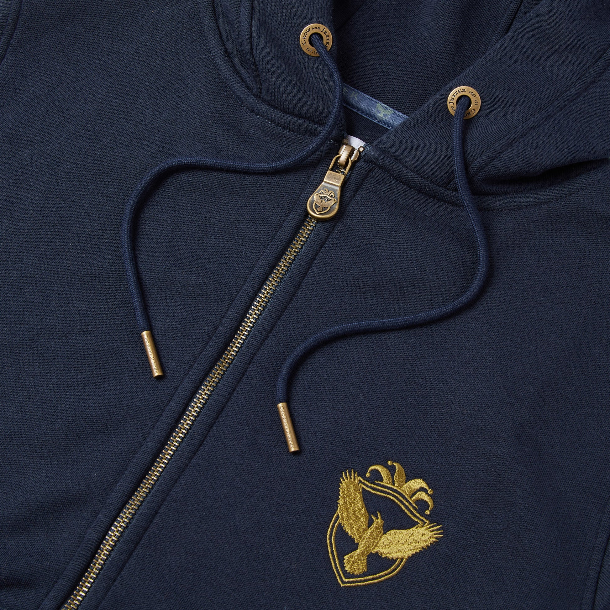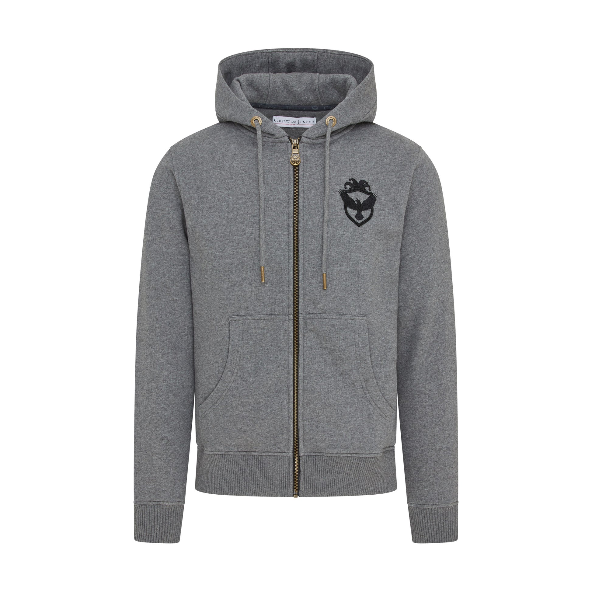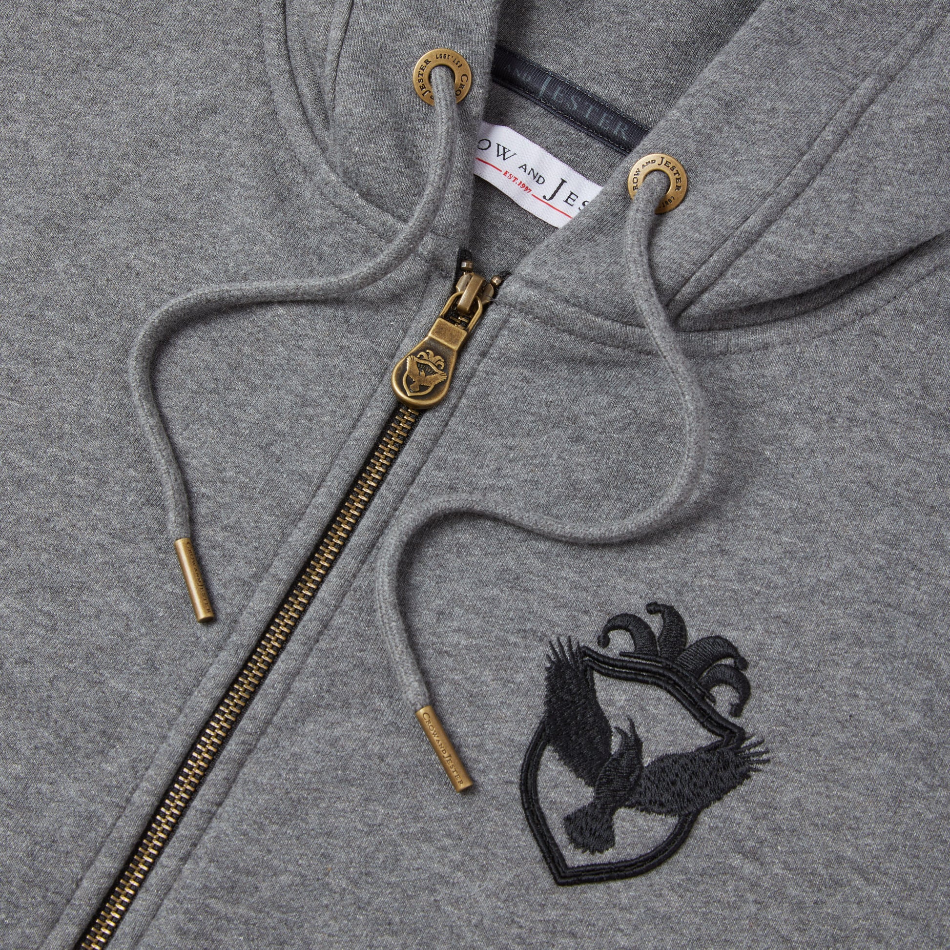 Cut in a modern slim silhouette, it features high-quality YKK zipper hardware paired with a bespoke Crow and Jester antique brass zip puller for a refined, durable finish. Signature brand details include custom cord eyelets and cord ends, a front pouch pocket, and our embroidered script logo across the chest, complemented by the Crow and Jester badge logo.