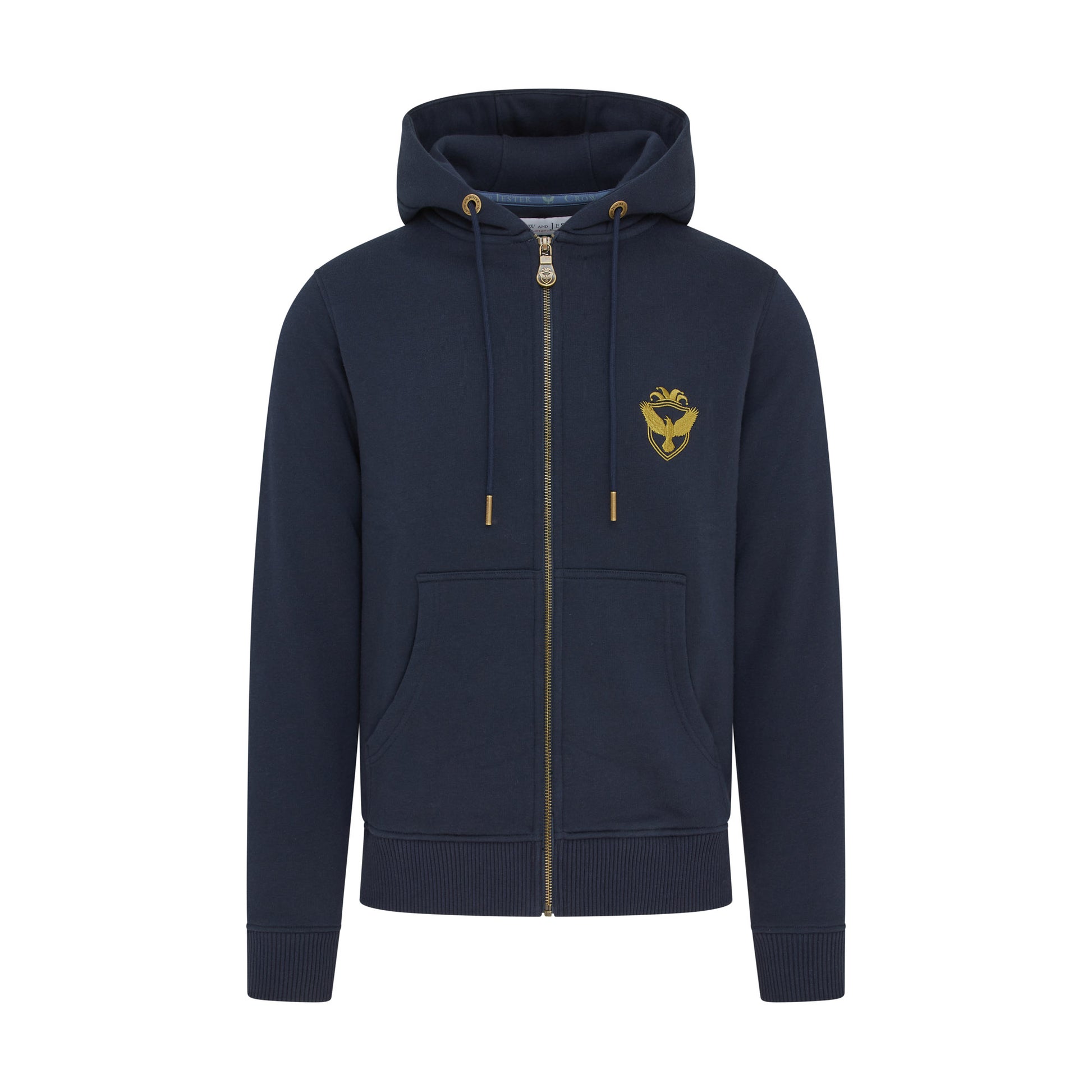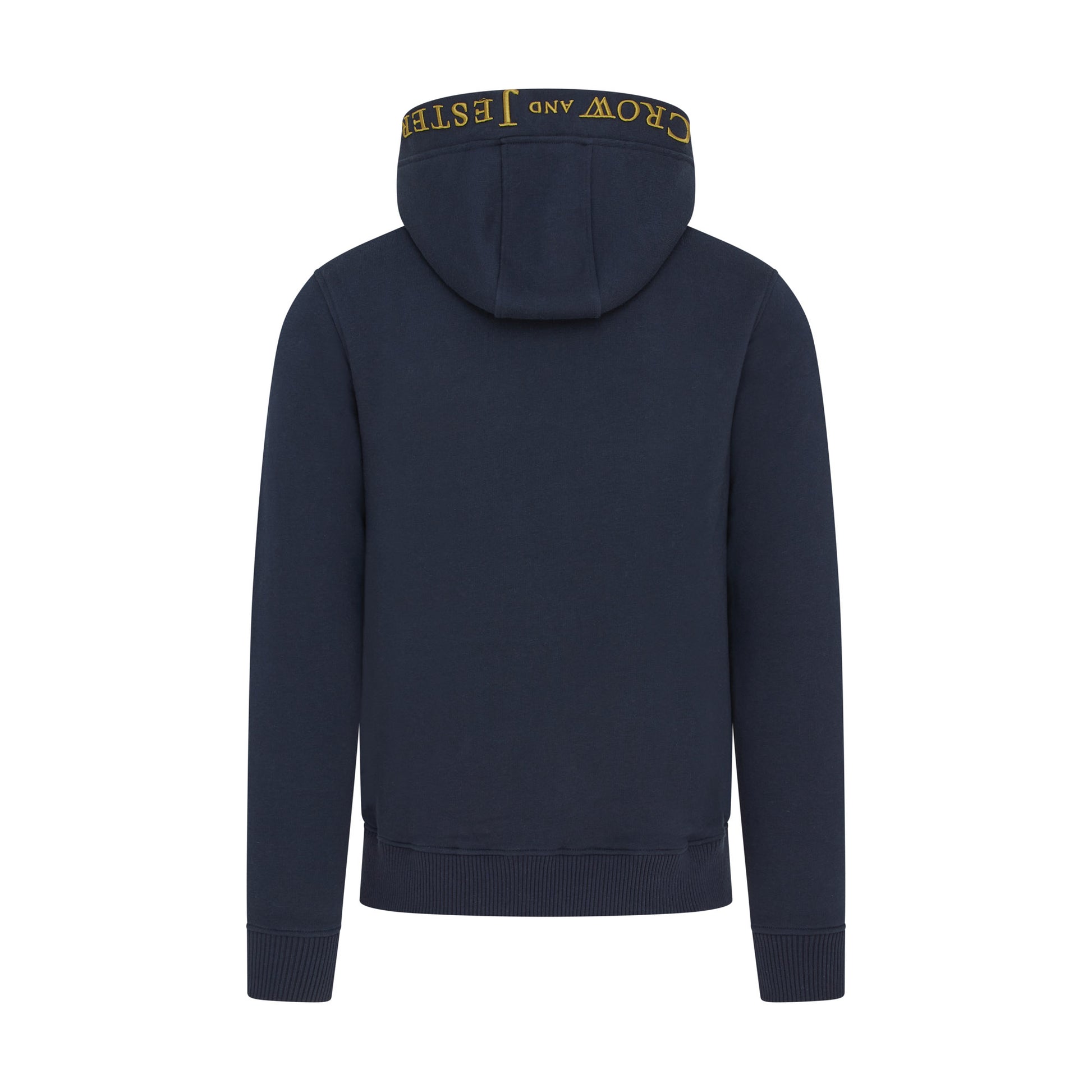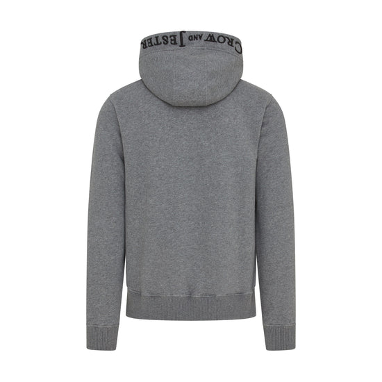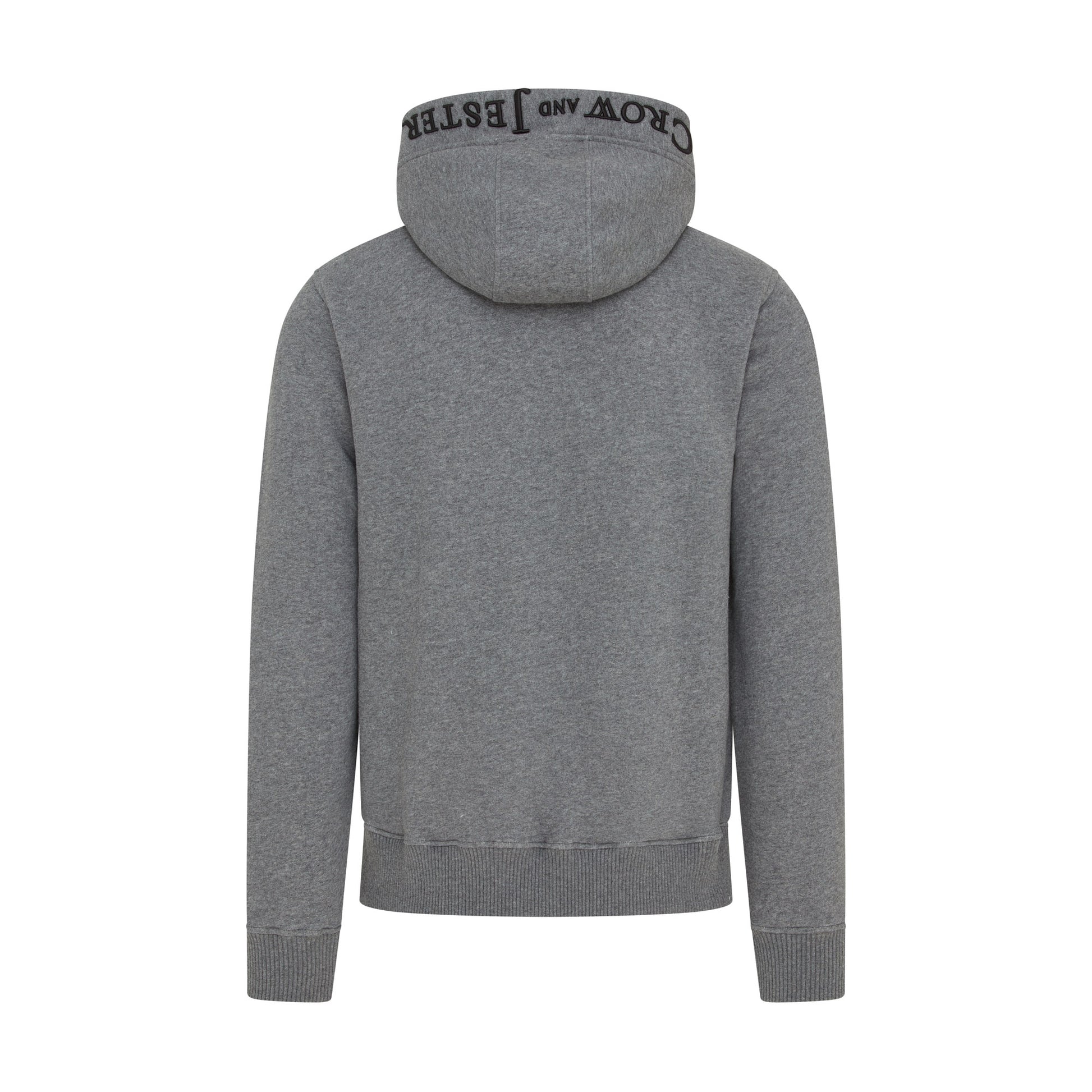 Cut in a modern slim silhouette, it features high-quality YKK zipper hardware paired with a bespoke Crow and Jester antique brass zip puller for a refined, durable finish. Signature brand details include custom cord eyelets and cord ends, a front pouch pocket, and our embroidered script logo across the chest, complemented by the Crow and Jester badge logo.